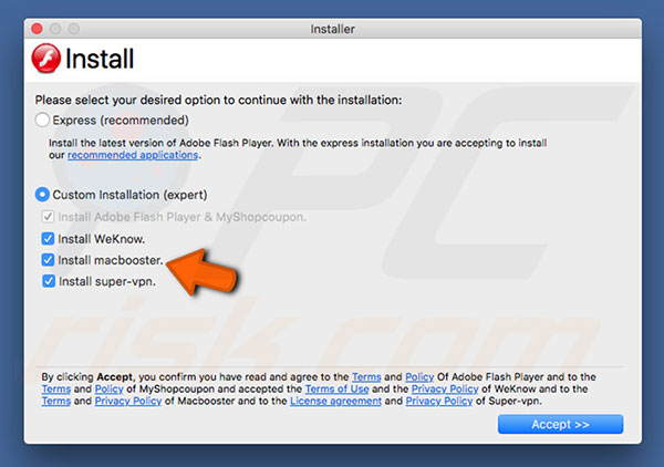 Zoals hierboven vermeld promoten ontwikkelaars MacBooster met behulp van een misleidende marketingmethode genaamd "bundling". Dit is een stiekeme installatie van applicaties van derden samen met reguliere software / apps. Ontwikkelaars informeren gebruikers niet of amper over de installatie van mogelijk ongewenste applicaties. Ze "bundelen" deze mogelijk ongewenste programma's en verbergen ze onder de "Aangepaste / Geavanceerde" instellingen (of andere secties) van downloaders en installers. Bovendien zullen veel gebruikers deze procedures overhaasten en stappen overslaan, wat kan leiden tot de onbedoelde installatie van mogelijk ongewenste programma's. Op deze manier stellen gebruikers hun systemen bloot aan een risico op infecties en brengen ze hun privacy in gevaar.