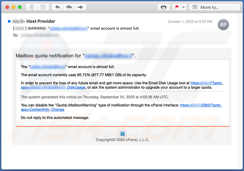 In order to prevent the loss of any future email and get more space. Use the Email Disk Usage tool at hxxps://*****/?goto_app=*************_DiskUsage, or ask the system administrator to upgrade your account to a larger quota.