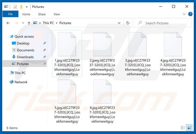 Ransomware is een vorm van malware die computers infecteert om de toegang tot bestanden te blokkeren door ze te versleutelen. Meestal codeert ransomware bestanden, wijzigt hun bestandsnamen en genereert het een tekstbestand om losgeld te eisen. Lookfornewitguy behoort tot de Phobos ransomware familie. Het hernoemt bestanden door de ID van het slachtoffer, ICQ_Lookfornewitguy (ICQ gebruikersnaam), en de ".Lookfornewitguy" extensie aan hun bestandsnamen toe te voegen. Het verandert bijvoorbeeld een bestand met de naam "1.jpg" in "1.jpg.id[C279F237-3203].[ICQ_Lookfornewitguy].Lookfornewitguy", "2.jpg" in "2.jpg.id[C279F237-3203].[ICQ_Lookfornewitguy].Lookfornewitguy", enzovoort. Het creëert twee tekstbestanden om losgeld te eisen: "info.hta" en "info.txt".