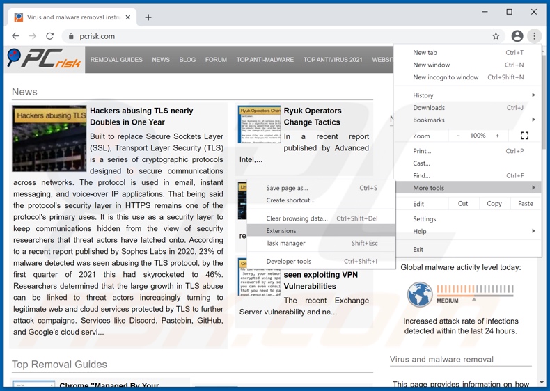 In het geopende venster klik je op Extensies, zoek naar recent geïnstalleerde verdachte extensies, selecteer deze en klik op Verwijderen.