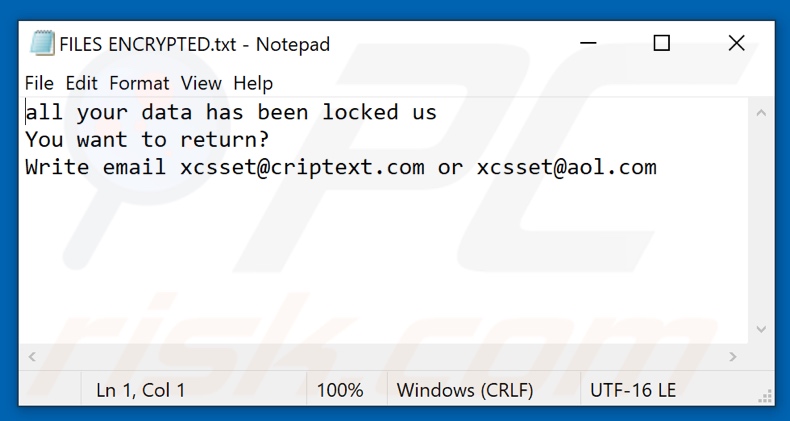In de notitie in "FILES ENCRYPTED.txt" staat dat de gegevens van slachtoffers zijn vergrendeld. Om de bestanden te herstellen, worden slachtoffers geïnstrueerd om te schrijven naar de vermelde e-mailadressen. De tekst in de pop-up geeft meer informatie over de ransomware infectie. Het verduidelijkt dat de gegevens zijn versleuteld. Het bericht herhaalt dat contact moet worden gelegd met de cybercriminelen via e-mail - om het herstelproces te starten. Bovendien moeten de onderwerpen/titels van de e-mails de ID van de slachtoffers zijn. Voor de ontsleuteling worden slachtoffers geïnformeerd dat ze losgeld in Bitcoin cryptocurrency zullen moeten betalen. De hoogte van de betaling wordt niet vermeld in de notitie; deze zal afhangen van hoe snel de communicatie tot stand komt. Voorafgaand aan de betaling kan de ontsleuteling worden getest door de criminelen een versleuteld bestand te sturen. Als het testbestand niet groter is dan 1MB (niet-gearchiveerd) en geen waardevolle informatie bevat (b.v. database, backup, groot Excel-blad, enz.) - zal het worden ontsleuteld en teruggestuurd. Het bericht wordt afgesloten met waarschuwingen, die waarschuwen dat het hernoemen van de versleutelde bestanden en/of pogingen om ze te ontsleutelen met tools/software van derden - kunnen leiden tot permanent gegevensverlies.
