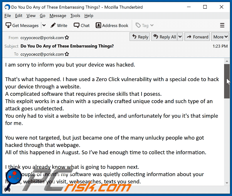 Weergave van de "I am sorry to inform you but your device was hacked" scam e-mail (GIF):