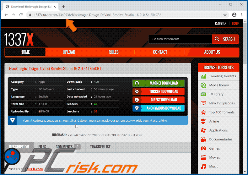 1337x[.]to is een onbetrouwbare website voor het delen van bestanden (Peer-to-Peer), die zogenaamd gebruikers in staat stelt verschillende bestanden te delen (bijv. software, audio, video, enz.). De inhoud wordt gedownload met magnetlinks en/of torrentbestanden. Het materiaal dat op dergelijke websites wordt gedeeld, is vaak in strijd met het auteursrecht en wordt vaak gebruikt voor de verspreiding van malware (bv. vermomd als of gebundeld met normale inhoud).