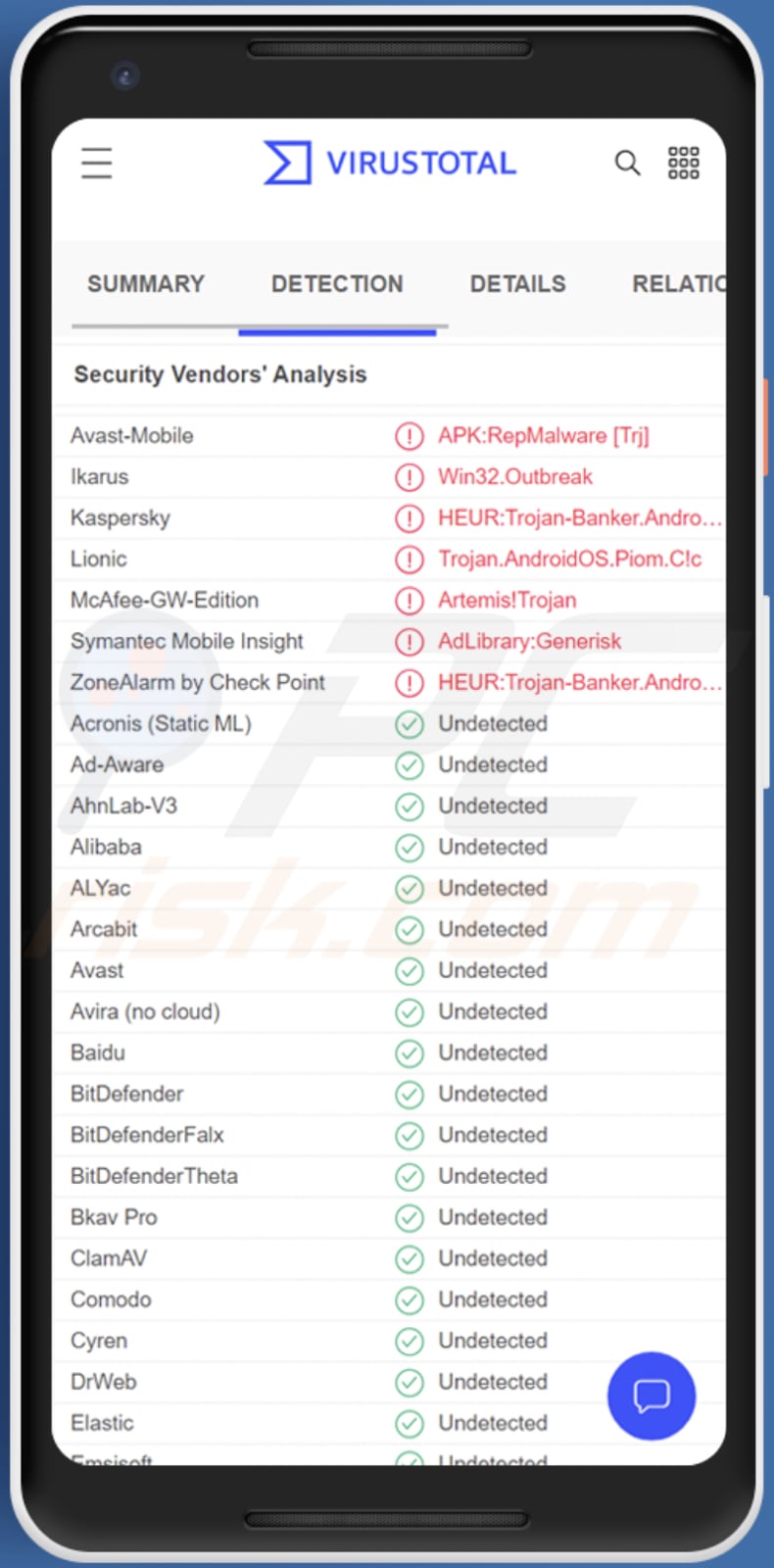 | Detectienamen | Avast-Mobile (APK:RepMalware [Trj]), Ikarus (Win32.Outbreak), Kaspersky (HEUR:Trojan-Banker.AndroidOS.Agent.jt), Symantec Mobile Insight (AdLibrary:Generisk), volledige lijst (VirusTotal) |