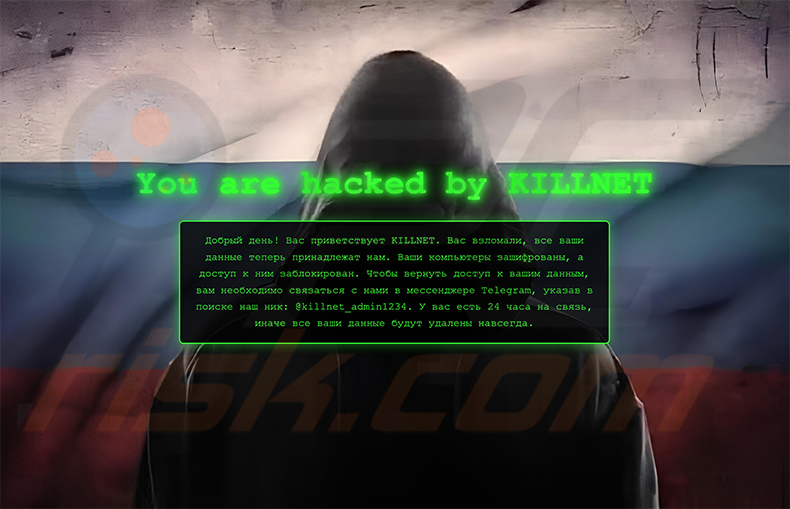 Добрый день! Вас приветствует KILLNET. Вас взломали, все ваши данные теперь принадлежат нам. Ваши компьютеры зашифрованы, а доступ к ним заблокирован. Чтобы вернуть доступ к вашим данным, вам необходимо связаться с нами в мессенджереram, указав в поиске наш ник: @killnet_admin1234. У вас есть 24 часа на связь, иначе все ваши данные будут удалены навсегда.