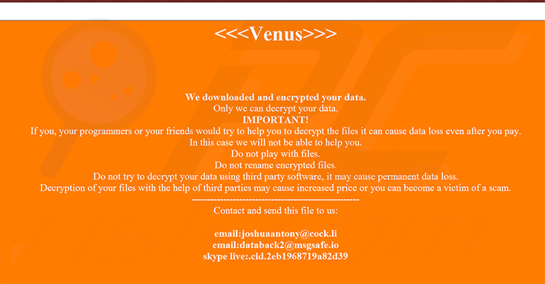 Tekst gepresenteerd in het tekstbestand van Venus ransomware ("README.txt"):