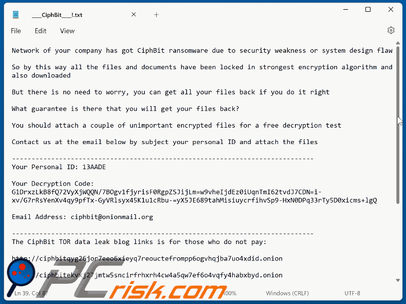 Zodra dit proces was voltooid, werd een losgeld eisend bericht met de titel "____CiphBit____!.txt" gedropt. Gebaseerd op de tekst die erin staat, is het duidelijk dat CiphBit zich richt op bedrijven in plaats van thuisgebruikers. Het is opmerkelijk dat deze ransomware dubbele afpersingstactieken gebruikt.