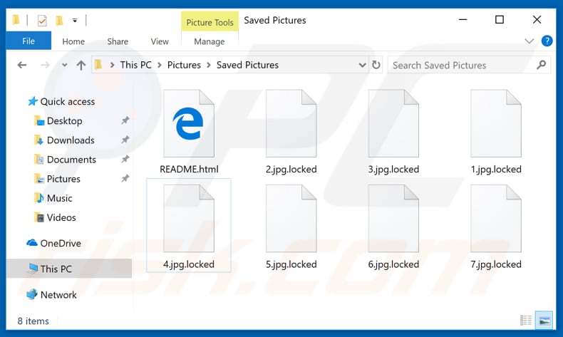 Het programma hernoemt alle versleutelde bestanden door de ".locked" extensie toe te voegen en creëert een losgeldbericht in een tekstbestand genaamd "README.html". Bijvoorbeeld, "1.jpg" wordt hernoemd door Tellyouthepass naar "1.jpg.locked".