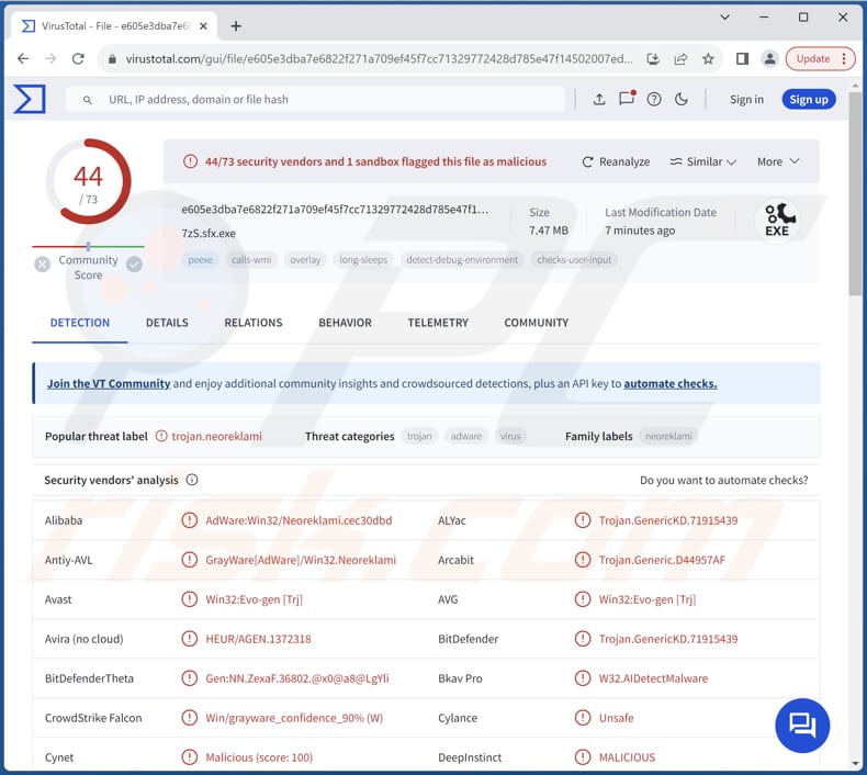 | Namen van detectie | Avast (Win32:Evo-gen [Trj]), Combo Cleaner (Trojan.GenericKD.71915439), ESET-NOD32 (Een variant van Win32/Adware.Neoreklami.OD), Kaspersky (Not-a-virus:UDS:AdWare.Win32.Neoreklami.gen), Volledige lijst (VirusTotal) |