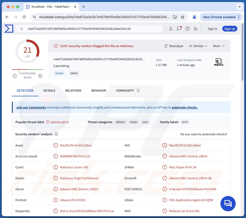 Tijdens het doorbladeren van bestandsinzendingen op de VirusTotal site, ontdekten onze onderzoekers de Capmaking.app adware. Bij nadere inspectie leerden we dat het deel uitmaakt van de Pirrit adware familie. Reclame-ondersteunde software is ontworpen om inkomsten te genereren voor de ontwikkelaars/uitgevers door middel van advertenties.