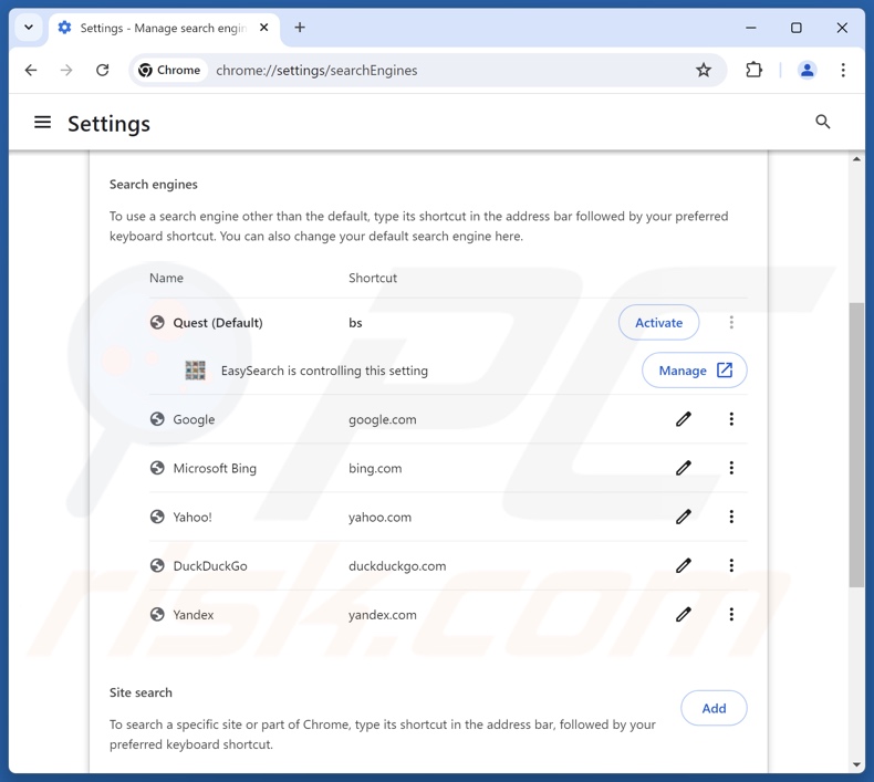 Het is relevant om te vermelden dat browser hijackers vaak persistentie-verzekeringsmechanismen gebruiken om hun verwijdering te bemoeilijken. EasySearch gebruikte de "Beheerd door uw organisatie" Google Chrome-functie voor dit doel.