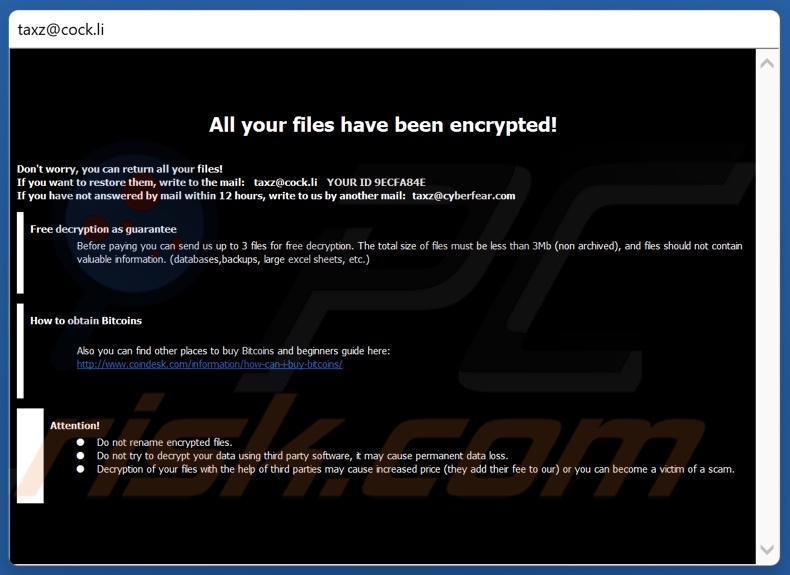 Het tekstbestand van Ztax ransomware instrueert alleen om het opgegeven adres te e-mailen voor herstel. De pop-up bevat meer informatie over de infectie. In deze notitie staat dat de gegevens van het slachtoffer werden versleuteld. Voor ontsleuteling moet losgeld worden betaald (bedrag niet gespecificeerd) in cryptocurrency Bitcoin. Voordat hij betaalt, kan het slachtoffer de ontsleuteling gratis testen op drie bestanden (binnen bepaalde specificaties).