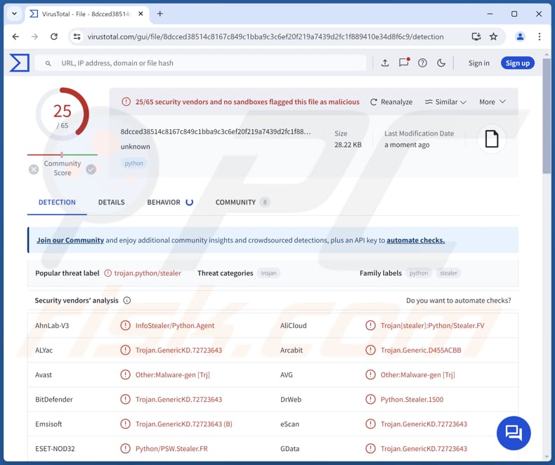 | Namen van detectie | Avast (Other:Malware-gen [Trj]), Combo Cleaner (Trojan.GenericKD.72723643), ESET-NOD32 (Python/PSW.Stealer.FR), Kaspersky (HEUR:Trojan-PSW.Python.Agent.gen), Microsoft (Trojan:Python/Multiverze), Volledige lijst (VirusTotal) |