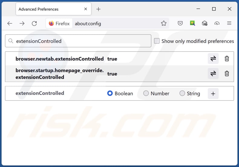 Typ in de zoekfilter bovenaan: "extensionControlled". Stel beide resultaten in op "false" door te dubbelklikken op elke invoer of door te klikken op de knop