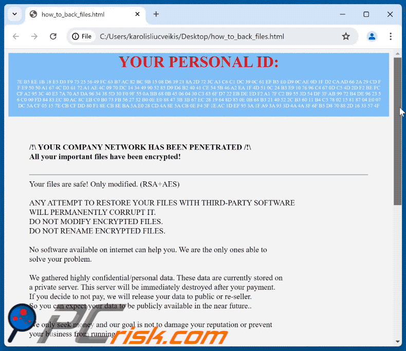 In de notitie staat dat de aanvallers gevoelige persoonlijke gegevens hebben verzameld en opgeslagen op een privéserver. Als het slachtoffer niet betaalt, worden de gegevens openbaar gemaakt of verkocht. Daarnaast vermeldt de notitie dat cybercriminelen aanbieden om 2-3 onbelangrijke bestanden gratis te ontsleutelen.