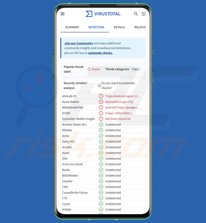| Namen detectie | Avast-Mobile (Android:Evo-gen [Trj]), Combo Cleaner (Android.Trojan.SpyAgent.QT), K7GW (Trojan ( 005a76541 )), Symantec Mobile Insight (AdLibrary:Generisk), Volledige lijst (VirusTotal) |