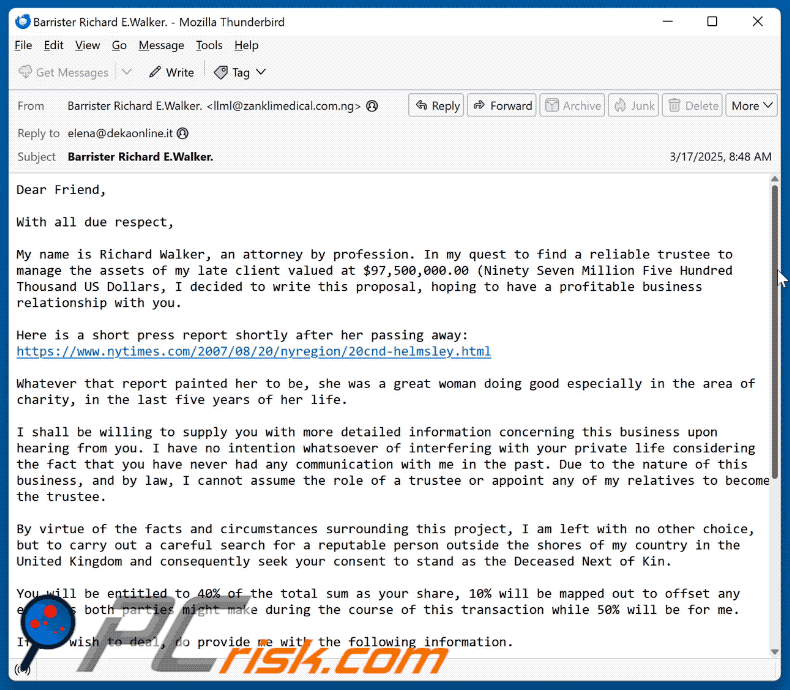 De spam e-mail met als onderwerp "Barrister Richard E.Walker." (kan variëren) begint met de afzender die zichzelf voorstelt als advocaat. Ze zijn op zoek naar een bewindvoerder voor de bezittingen van hun overleden cliënt, ter waarde van zevenennegentig en een half miljoen USD.