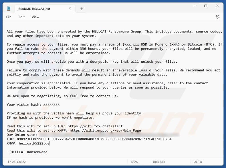 De tweede variant bevat een vergelijkbare losgeldbrief. Er staat echter in dat slachtoffers binnen 336 uur losgeld in Monero (XMR) of Bitcoin (BTC) moeten betalen om hun bestanden te herstellen. Naast de contactgegevens in de eerste variant, bevat de tweede variant een e-mailadres (hellcat@5222.de).