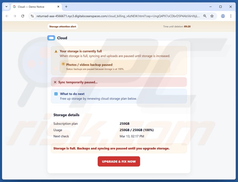 Het doel van deze frauduleuze e-mail is om ontvangers ertoe te verleiden op de bijgevoegde link te klikken, die naar misleidende websites leidt. Deze websites zijn zo ontworpen dat ze eruitzien als legitieme portalen voor cloudopslag of abonnementsbeheer. Ze beweren dat de opslagruimte van de gebruiker vol is of dat het verlengen van een abonnement is mislukt, waarschuwen dat back-ups of uploads zijn onderbroken en dreigen met gegevensverlies als de betalingsgegevens niet onmiddellijk worden bijgewerkt.