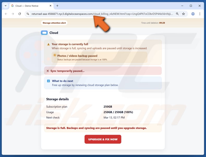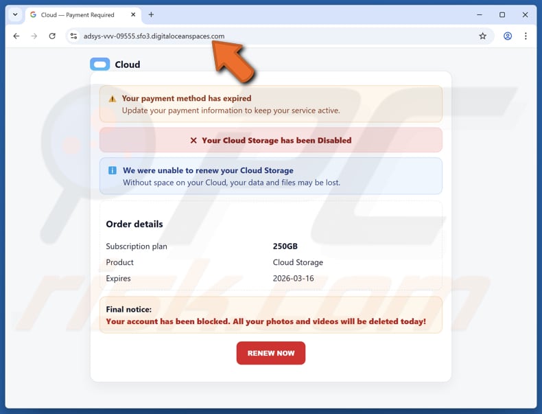 Het bericht wordt gepresenteerd als een automatisch gegenereerde melding van clouddiensten en bevat een optie om "Opslag nu opnieuw te activeren". Deze link leidt naar frauduleuze websites. Op deze pagina’s worden soortgelijke beweringen gedaan als in de e-mail: er wordt gesuggereerd dat er een probleem is met de opslagruimte of het abonnement en dat er onmiddellijk actie moet worden ondernomen om gegevensverlies te voorkomen.