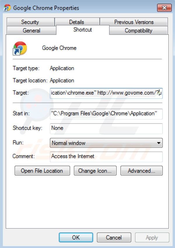 De Govome browser hijacker verandert het "Doel"-veld van de Google Chrome snelkoppeling. Om dit te herstellen - zoek je Google Chrome snelkoppeling op je Desktop en klik er met de rechtermuisknop op. In het geopende menu kies je "Eigenschappen". In het geopende scherm zoek je het Doel-veld en verwijder je alle tekst (hxxp://www.govome.com/...) die zich bevindt achter "C:\Program Files\Google\Chrome\Application\chrome.exe"