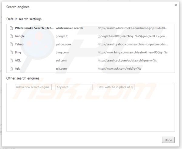 (rechterbovenhoek van Google Chrome) selecteer "Instellingen", in de zoeksectie klik "Beheer zoekmachines...", verwijder "WhiteSmoke Search" en selecteer je zelfgekozen zoekmachine of voeg ze toe.