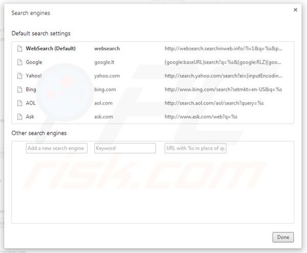 (rechterbovenhoek van Google Chrome) selecteer "Instellingen", in de zoeksectie klik "Beheer zoekmachines...", verwijder "WebSearch" en selecteer je zelfgekozen zoekmachine of voeg ze toe.