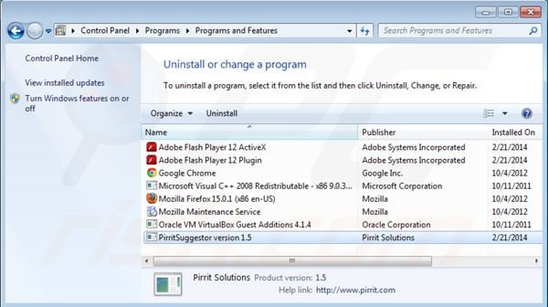 In het programma's verwijderen-scherm: zoek naar "Pirrit Suggestor" selecteer deze verwijzing en klik op "Verwijderen" of "Deïnstalleren"