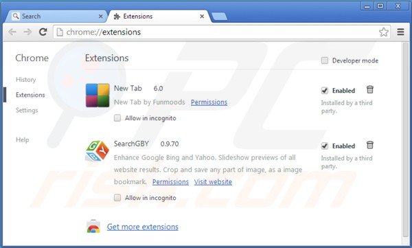 (rechterbovenhoek van Google Chrome) slecteer "Instellingen" en klik op "Extensies". Zoek "New Tab" en "SearchGBY" selecteer deze verwijzingen en klik op een prullenbak-icoon.