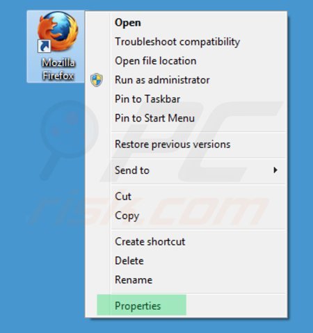 Deze hijacker verandert het "Doel"-veld van de Mozilla FireFox snelkoppeling. Om dit te herstellen - zoek je Mozilla FireFox snelkoppeling op je Desktop en klik er met de rechtermuisknop op. In het geopende menu kies je "Eigenschappen". In het geopende scherm zoek je het Doel-veld en verwijder je alle tekst (hxxp://www.22find.com/...) die zich bevindt achter"C:\Program Files\Mozilla Firefox\firefox.exe"