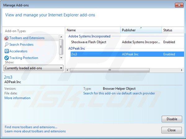 (in de rechterbovenhoek van Internet Explorer), selecteer "Beheer Add-ons." Zoek naar "2rs3", selecteer deze verwijzing en klik op "Verwijderen".