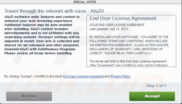 Internetgebruikers zouden moeten weten dat de meeste adware verspreid wordt door download managers in freeware download websites (bijvoorbeeld soft32.com, download.com, softonic.com en vele andere). Hierdoor is het de moeite waard te vermelden dat de meerderheid van deze websites kleine download-programma's (download managers) gebruiken om geld te verdienen met hun gratis diensten. Download managers bieden gebruikers aan bijkomende geadverteerde browser extensies te installeren samen met de geselecteerde gratis software. Meestal leidt het roekeloos downloaden en installeren van freeware tot besmettingen met malware of adware. Dit kan voorkomen worden door het goed controleren van elke stap in het downloadproces en het nooit accepteren dat bijkomende applicaties geïnstalleerd worden. Als je de reeds gedownloade software gaat installeren dan kies je best steeds voor de "Aangepaste" of "Geavanceerde" installatie-opties in plaats van "Snel" of "Standaard", deze stap zal alle gebundelde applicaties aan het licht brengen die proberen in het geheim mee geïnstalleerd te worden en je zal ervoor kunnen kiezen de installatie ervan te weigeren. Gebruikers die AtuZi al op hun computers geïnstalleerd hebben en nu "Ads by AtuZi", "Powered by AtuZi" en "AtuZi Deals" advertenties zien tijdens het surfen op internet zouden deze verwijderingsgids moeten volgen en de AtuZi adware uit hun internet browsers verwijderen.