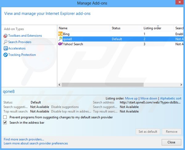(in de rechterbovenhoek van Internet Explorer), selecteer "Beheer Add-ons." In het geopende venster selecteer "Zoekmachines," stel "Google," "Bing" of een andere zoekmachine naar keuze in en verwijder "vi-view".