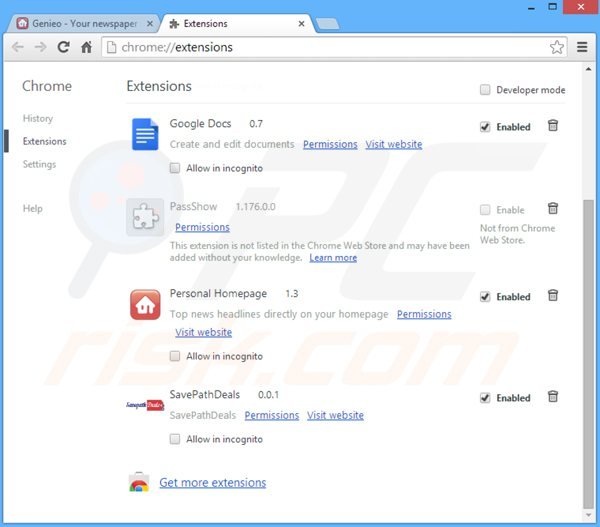 (in de rechterbovenhoek van Google Chrome), selecteer "Instellingen" en klik op "Extensies". Zoek naar browser add-ons die recent geïnstalleerd werden en verdacht lijken selecteer deze verwijzingen en klik op het prullenmand-icoon. ("Personal Homepage")