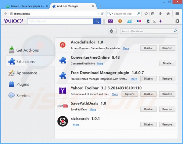 Verwijder aan search.genieo.com gerelateerde Mozilla Firefox add-ons: