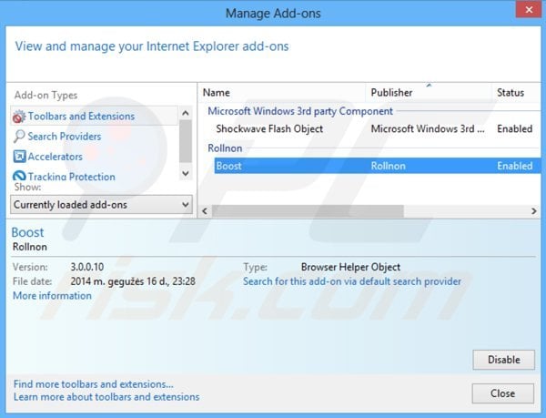 (in de rechterbovenhoek van Internet Explorer), selecteer "Beheer Add-ons." Zoek naar 'Boost', klik op "Verwijderen".