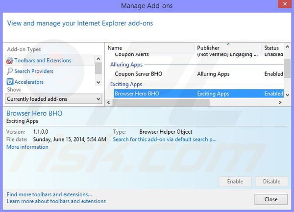 (in de rechterbovenhoek van Internet Explorer), selecteer "Beheer Add-ons." Zoek naar 'BrowserProtector', selecteer deze verwijzing en klik op "Verwijderen". Merk op dat de BrowserProtector advertenties ook kunnen veroorzaakt worden door andere adware. In het Add-ons beheren scherm verwijder je daarom alle verdachte verwijzingen.