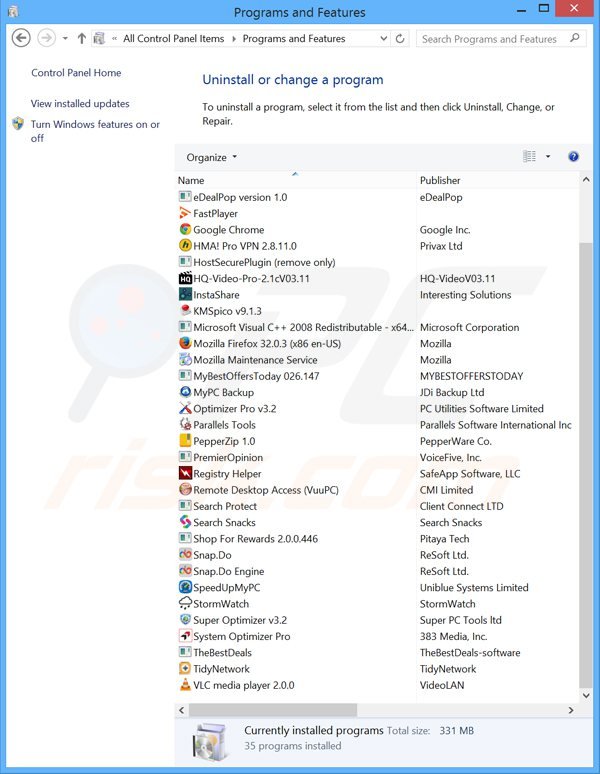 In het programma's verwijderen-scherm zoek je naar recent geïnstalleerde applicaties die je verdacht lijken, selecteer deze verwijzingen en klik op "Deïnstalleren" of "Verwijderen".