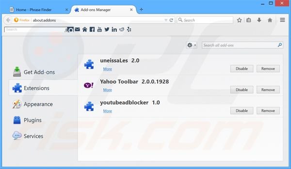 Op het moment van onderzoek installeerde Phrase Finder geen browser plug-ins in Internet Explorer, Google Chrome of Mozilla Firefox het werd echter wel gebundeld met andere adware. Daarom wordt je aangeraden alle mogelijk ongewenste browser add-ons uit je internet browsers te verwijderen.