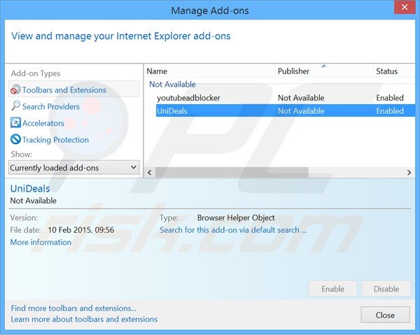 (in de rechterbovenhoek van Internet Explorer), selecteer "Beheer Add-ons." Zoek naar "uniDeals" en "youtubeadblocker", selecteer deze verwijzingen en klik op "Verwijderen".