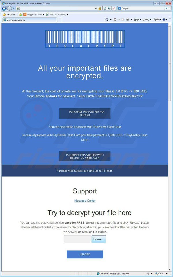 Waty meer is, TeslaCrypt zal je desktopachtergrond veranderen en zal een bestand creëren genaamd HELP_TO_DECRYPT_YOUR_FILES.txt en dit op je bureaublad plaatsen. Een opstartscherm zal je uitleggen dat je een betaling moet doen binnen de drie dagen. Het scherm bevat ook knoppen die de gebruiker toelaten om de betalingsstatus te checken, een sleutel in te geven en een link naar een TOR-betalingssite waar een gratis bestandsontsleutelingstest kan uitgevoerd worden.