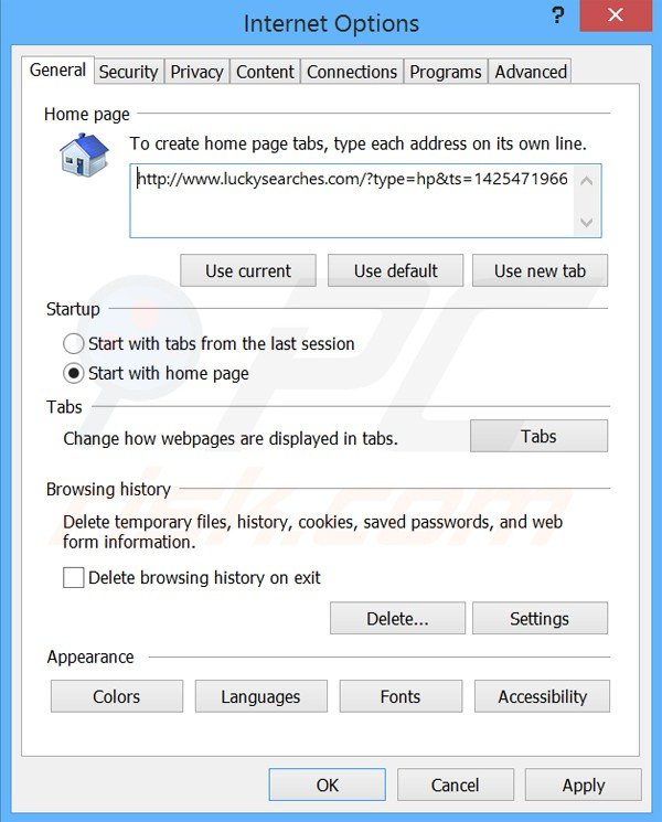 (in de rechterbovenhoek van Internet Explorer) selecteer "Internet Opties", in het geopende scherm verwijder je hxxp://www.luckysearches.com en geef je het domein van je voorkeur in dat zal openen elke keer als je Internet Explorer opstart.