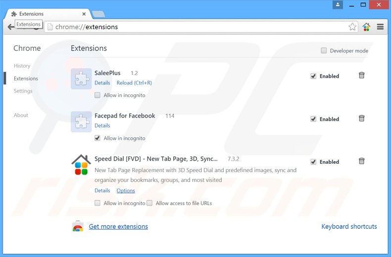 (rechterbovenhoek van Google Chrome), selecteer "Instellingen" en klik op "Extensies". Zoek naar "Sale Charger", selecteer deze verwijzing en klik op een prullenbak-icoon.