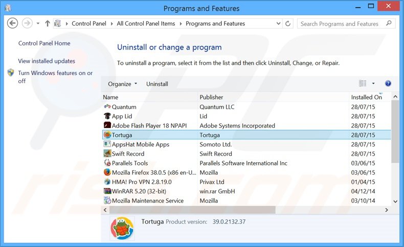 In het programma's verwijderen-scherm zoek je naar "Tortuga" en klik op "Deïnstalleren" of "Verwijderen".