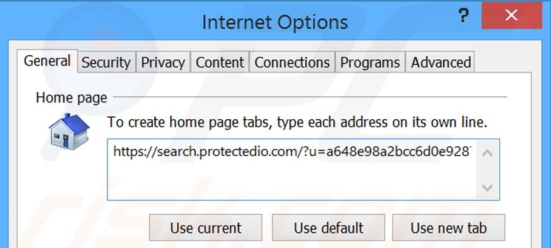 (in de rechterbovenhoek van Internet Explorer) selecteer "Internet Opties", in het geopende scherm verwijder je hxxp://search.protectedio.com en geef je het domein van je voorkeur in dat zal openen elke keer als je Internet Explorer opstart.