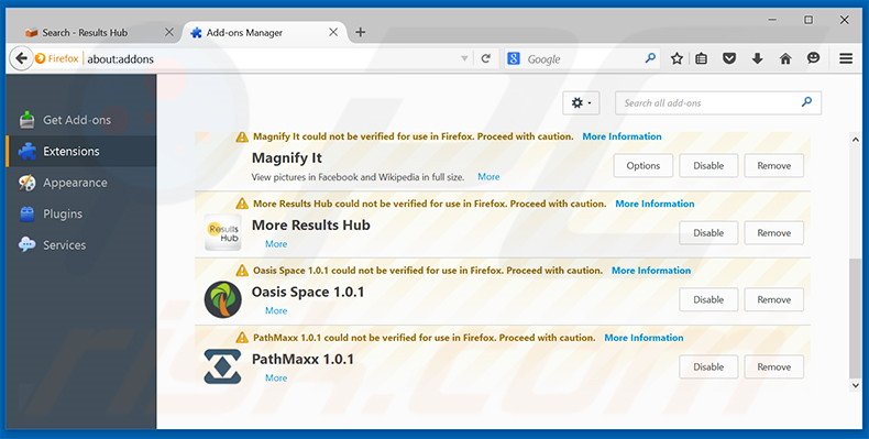 (in de rechterbovenhoek van het hoofdscherm) selecteer "Add-ons". Klik op "Extensies" en verwijder 'Results Hub' en andere verdachte recent-geïnstalleerde plug-ins.