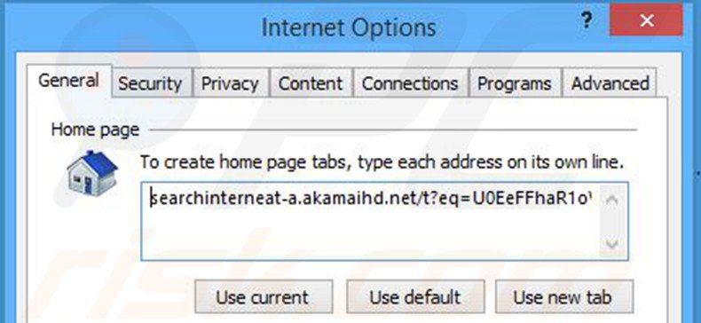 (in de rechterbovenhoek van Internet Explorer) selecteer "Internet Opties", in het geopende scherm verwijder hxxp://searchinterneat-a.akamaihd.net en geef je het domein van je voorkeur in dat zal openen elke keer als je Internet Explorer opstart.