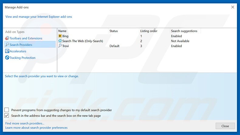 (in de rechterbovenhoek van Internet Explorer) selecteer "Add-ons beheren". In het geopende scherm selecteer je "Zoek Providers", kies "Google", "Bing" of gelijk welke andere zoekmachine van je keuze als standaard zoekmachine en verwijder "mpc".