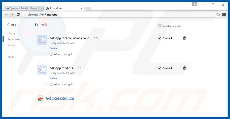 (rechterbovenhoek van Google Chrome), selecteer "Instellingen" en klik op "Extensies". Zoek naar "Splendor Search", selecteer deze en klik op een prullenbak-icoon.